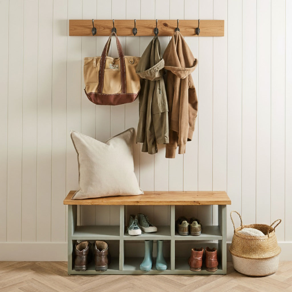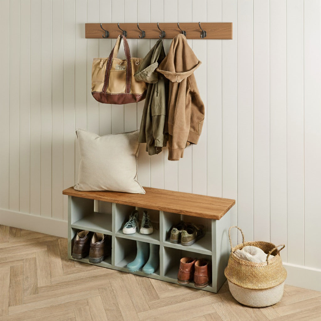 Anpassbare, FSC-zertifizierte Kleiderstange aus massivem Kiefernholz, auf Ihre Wunschlänge zugeschnitten. Erhältlich in verschiedenen Farrow & Ball-Farben oder mit sechs natürlichen Wachsnuancen, die die Holzmaserung hervorheben. Wählen Sie zwischen charaktervollen Haken aus massivem Gussstahl in Schwarz oder Antik-Eisen-Optik oder Haken aus massivem Birkenholz im Shaker-Stil. Die Haken sind bei lackierten Oberflächen unbehandelt oder passend zur gewählten natürlichen Wachsoberfläche des Kiefernholzes gewachst.
