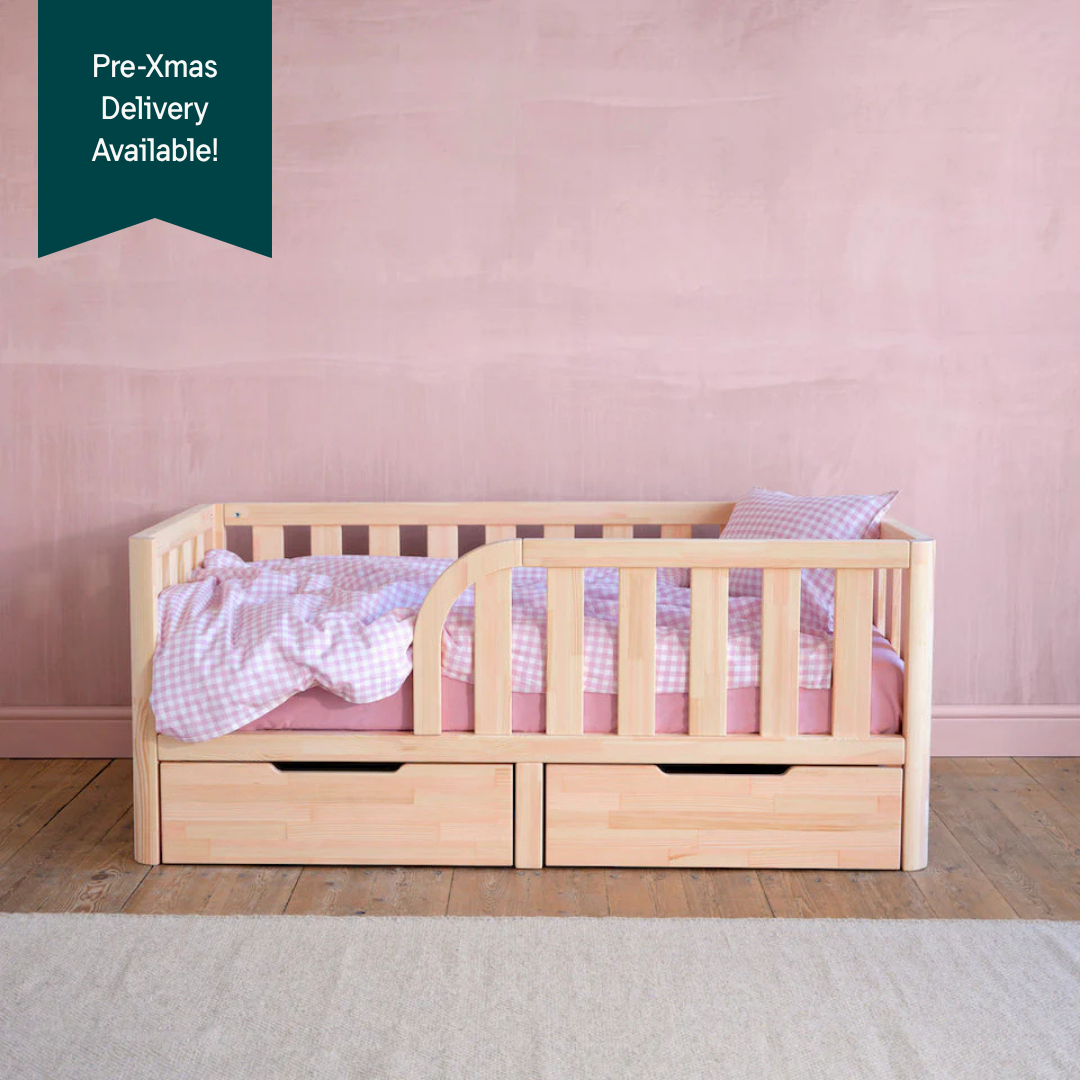 Wunderschönes, naturbelassenes Kiefernholzbett in Top-Qualität für Kleinkinder und Kinder . Entworfen passend zur Montessori- und skandinavischen Raumgestaltung und den pädagogischen Prinzipien der kindlichen Entwicklung. Einfache Montage dank beiliegender Anleitung und Werkzeug. Jetzt mit zusätzlichen Schubladen für extra Stauraum im Kinderzimmer. Erhältlich in verschiedenen Größen, von Kleinkindgröße über Einzel-, Doppel- bis hin zu Zweibettgröße.
