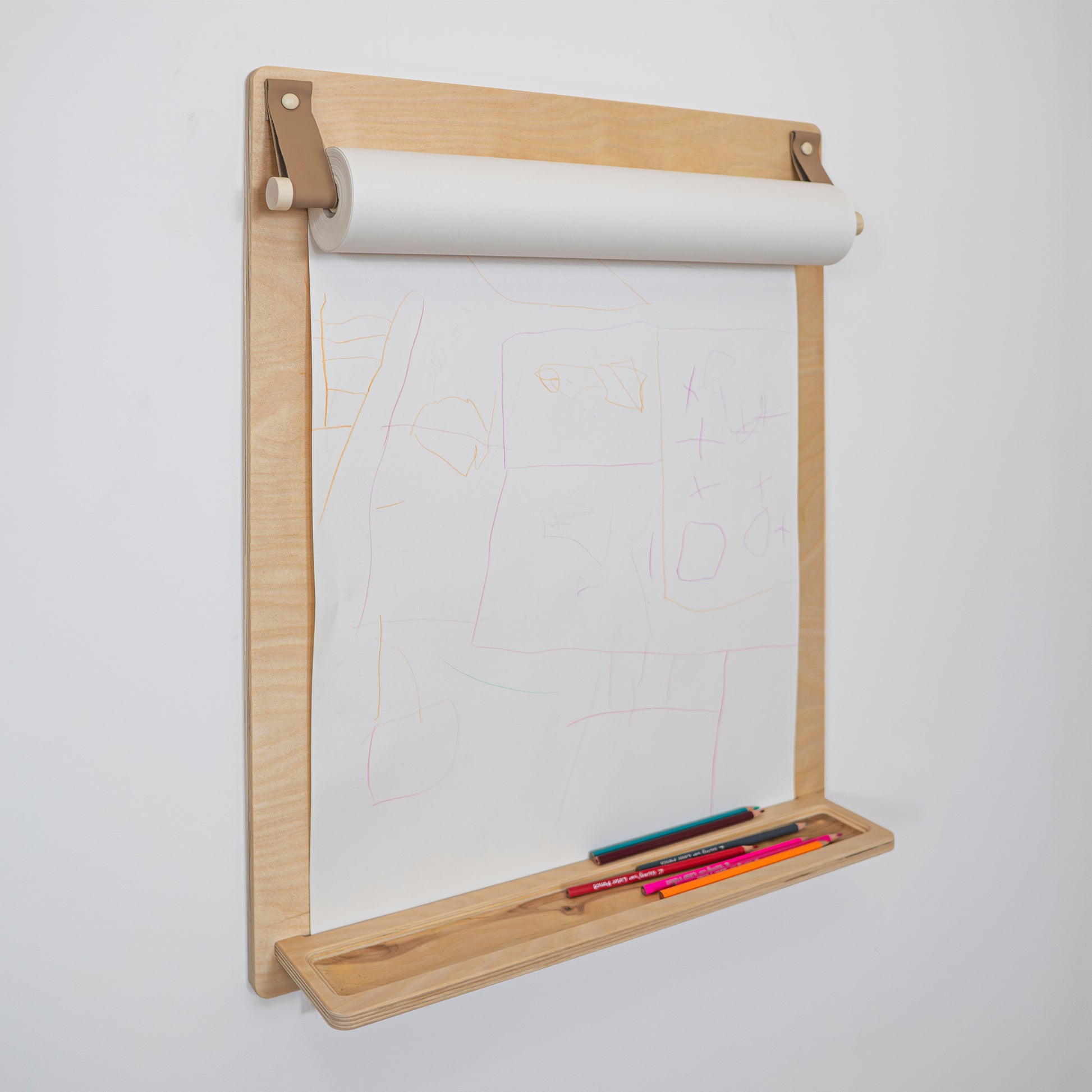 A handcrafted wall mounted drawing board made from solid birch plywood, designed to keep art time simple and mess free. Fits flush to the wall with concealed keyhole fittings. The included 30m paper roll is held by a grooved birch pole and leather-look straps. Minimal assembly required.