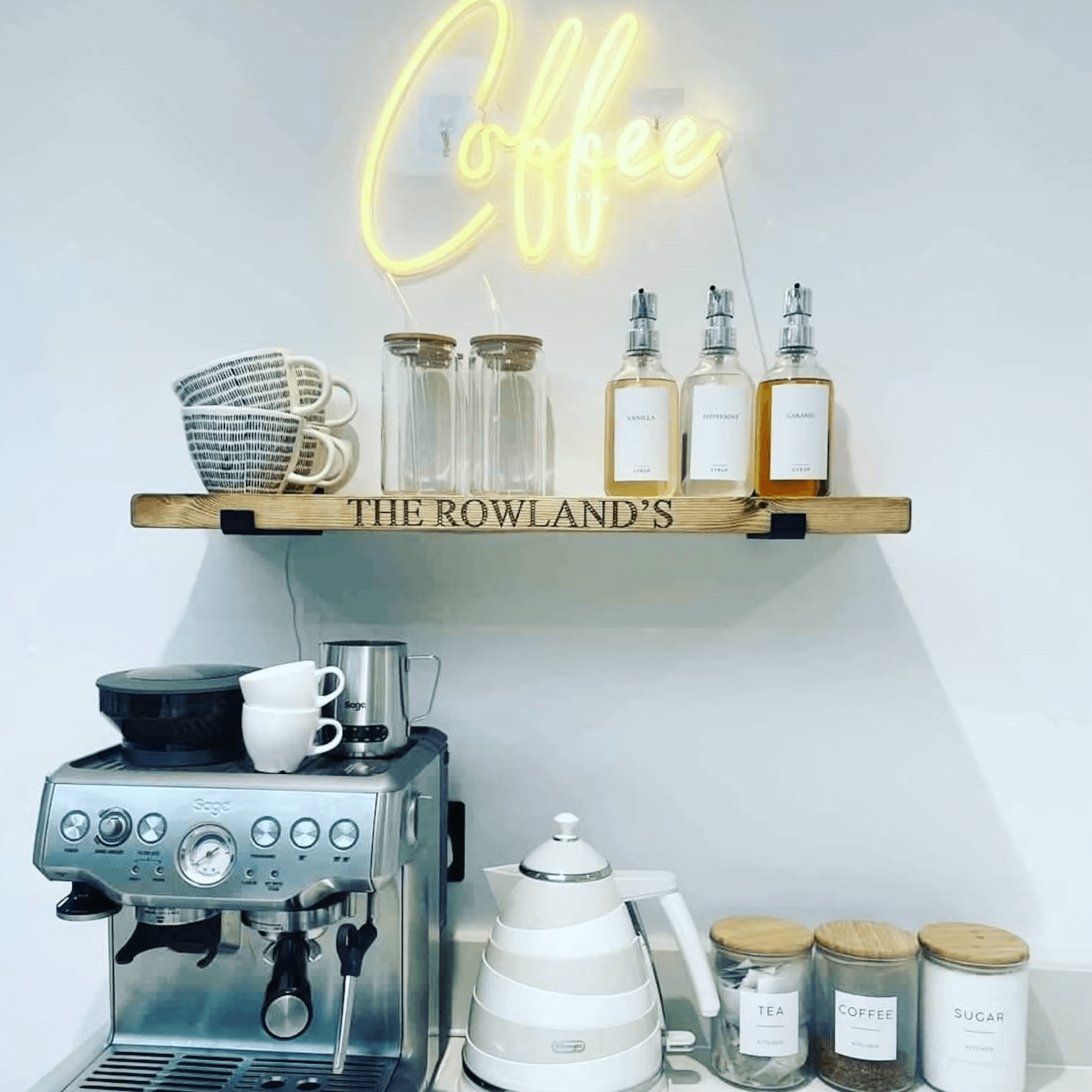 Étagères sur mesure en planches d'échafaudage recyclées, avec votre gravure personnalisée.