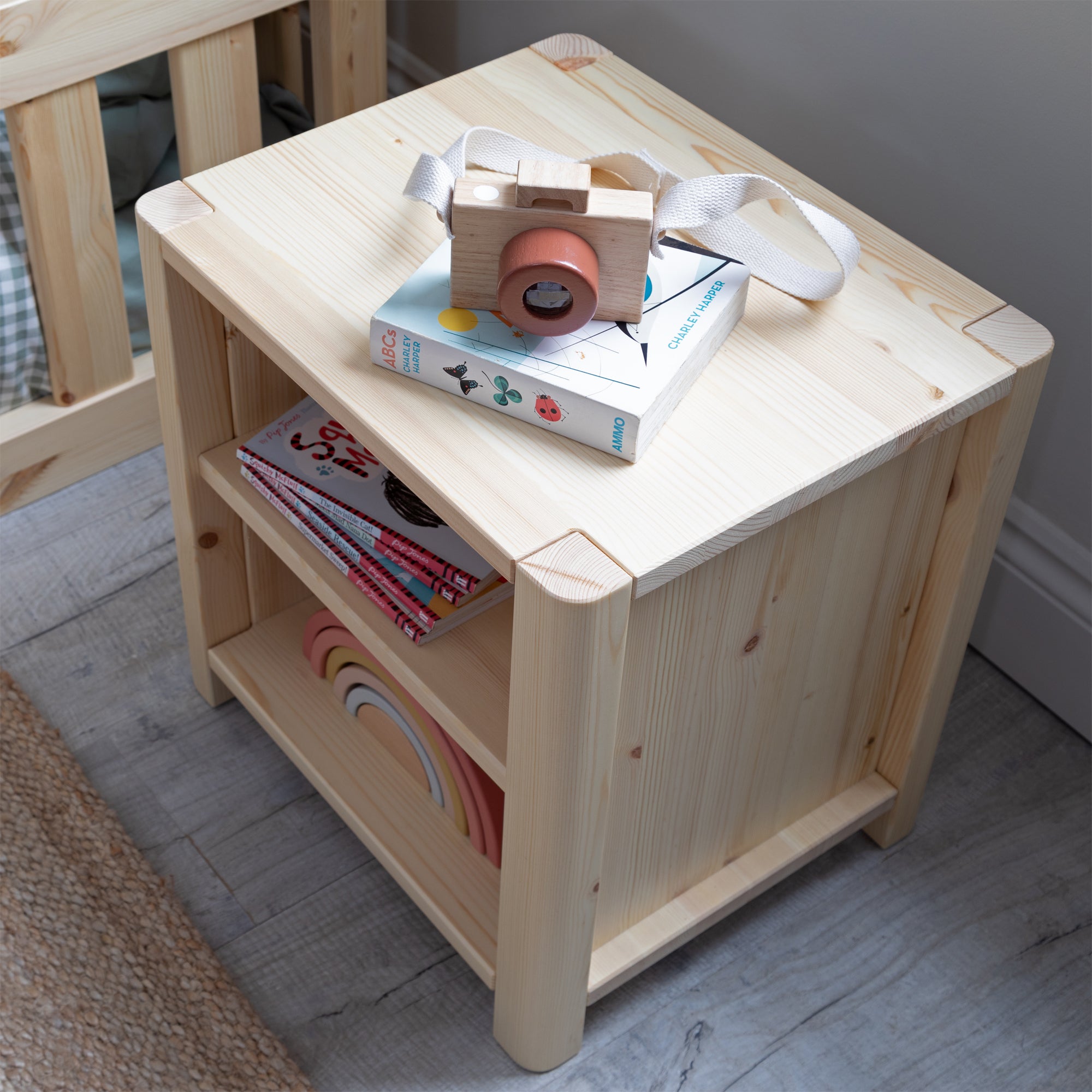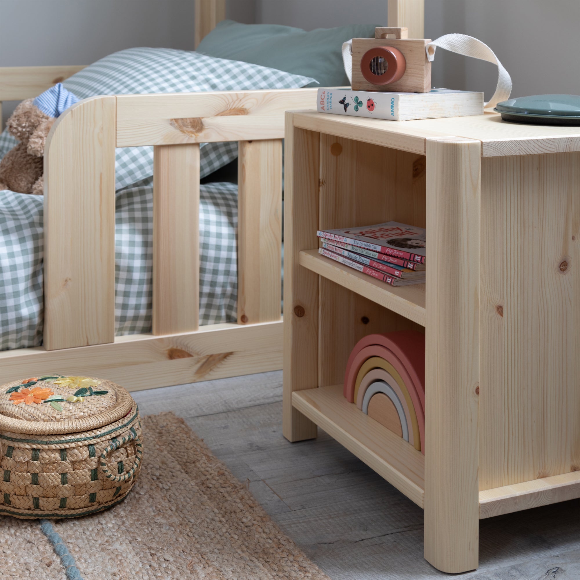 Notre étagère de chevet compacte se glisse parfaitement sur nos lits d'enfant Transition et nos lits cabane, offrant un espace flexible pour les essentiels du coucher.