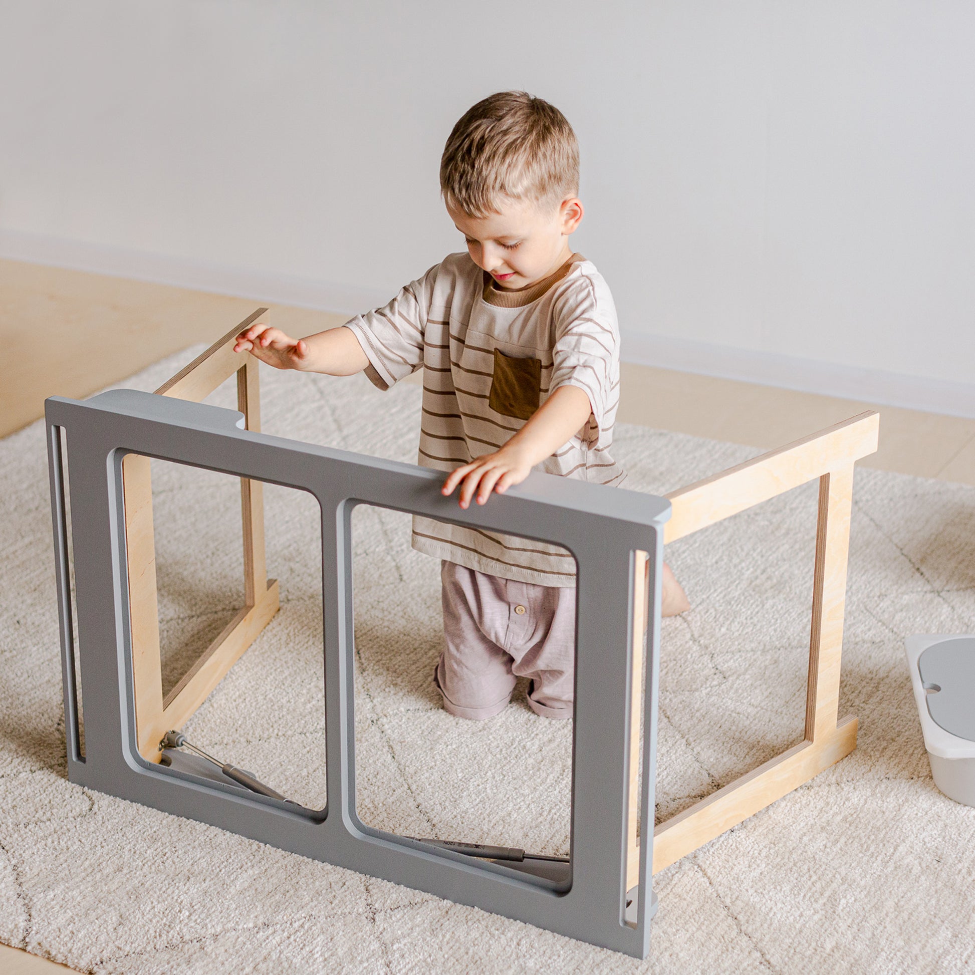 This compact, folding Kids Activity Table can be used for both meals times and play, from crafting to model making. Featuring plastic box storage set into the desk, with easy to remove finger pull off lids, which can be used for everything from pads & crayons to lego. Boxes can be removed to store the desk flat and tuck away when not in use. Offered in black, grey or white with birch plywood folding legs.