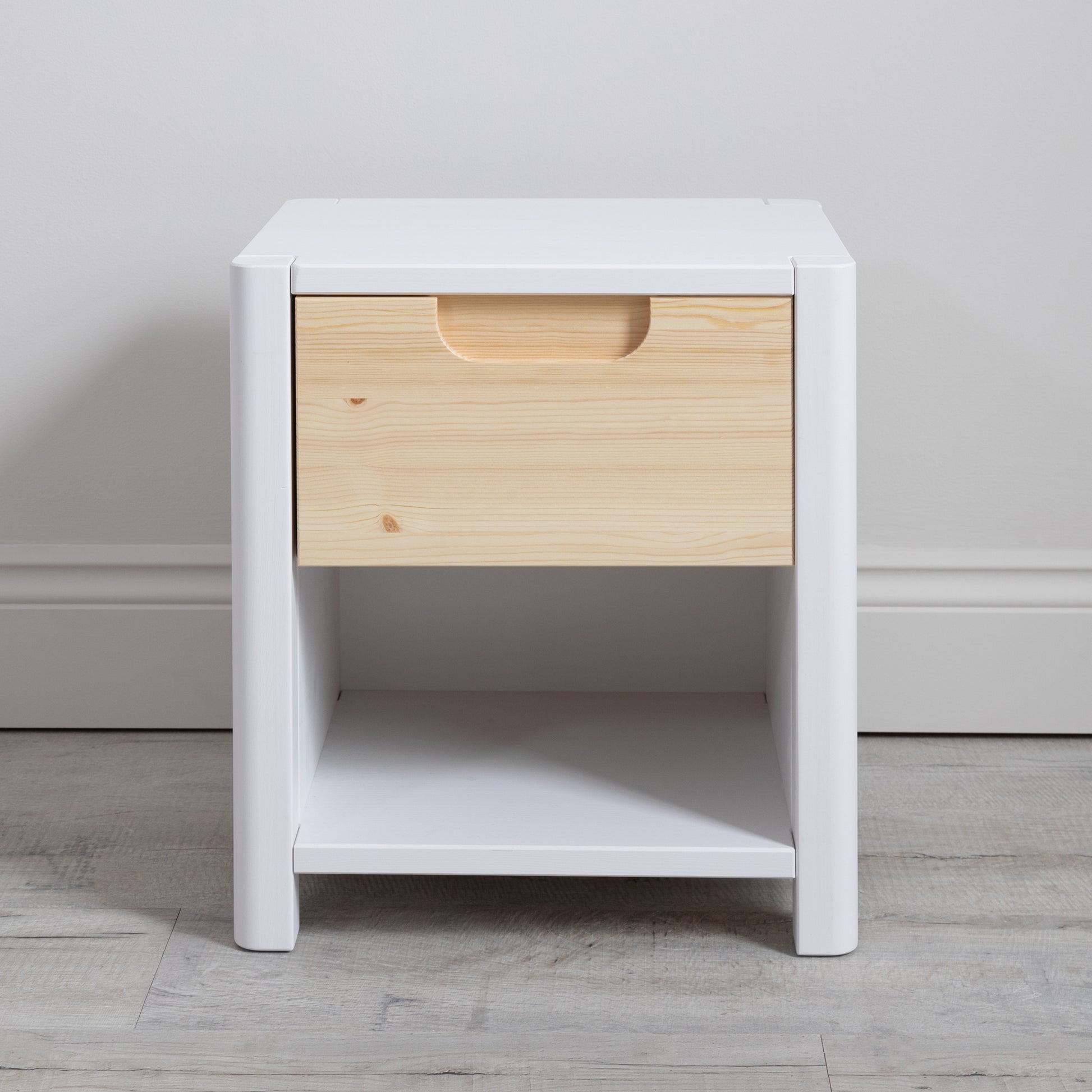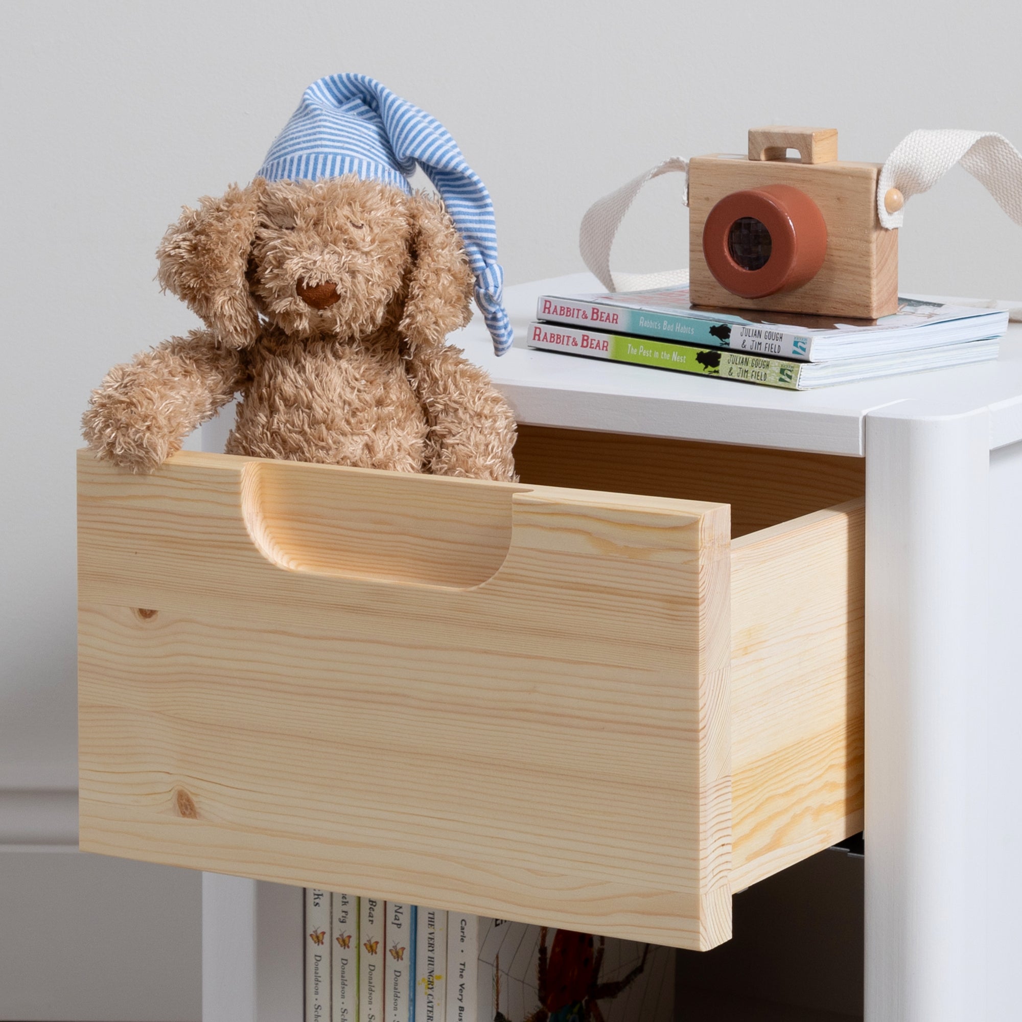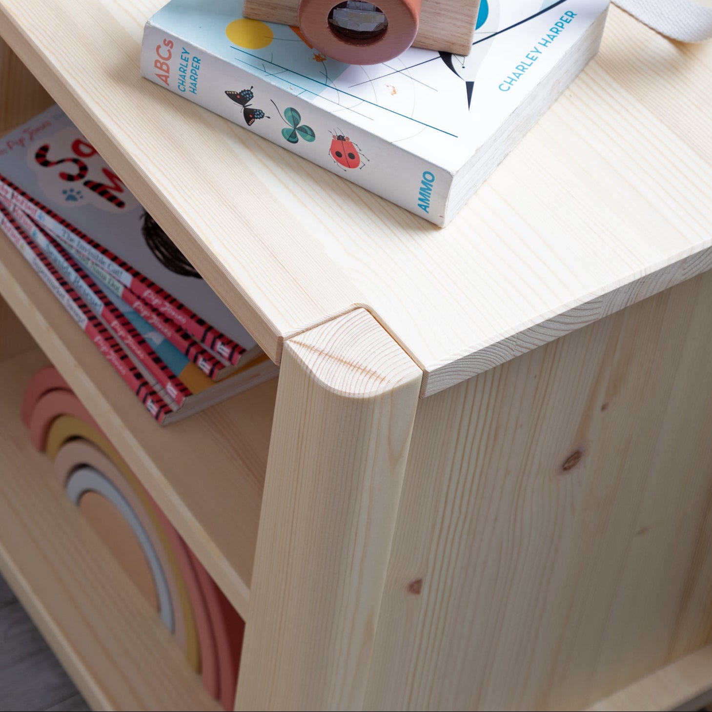 Available with open shelving or a single soft-close drawer, and in two neutral, child-safe water-based wax finishes, this bedside table is designed to coordinate seamlessly with the Roomix toddler bed range.
